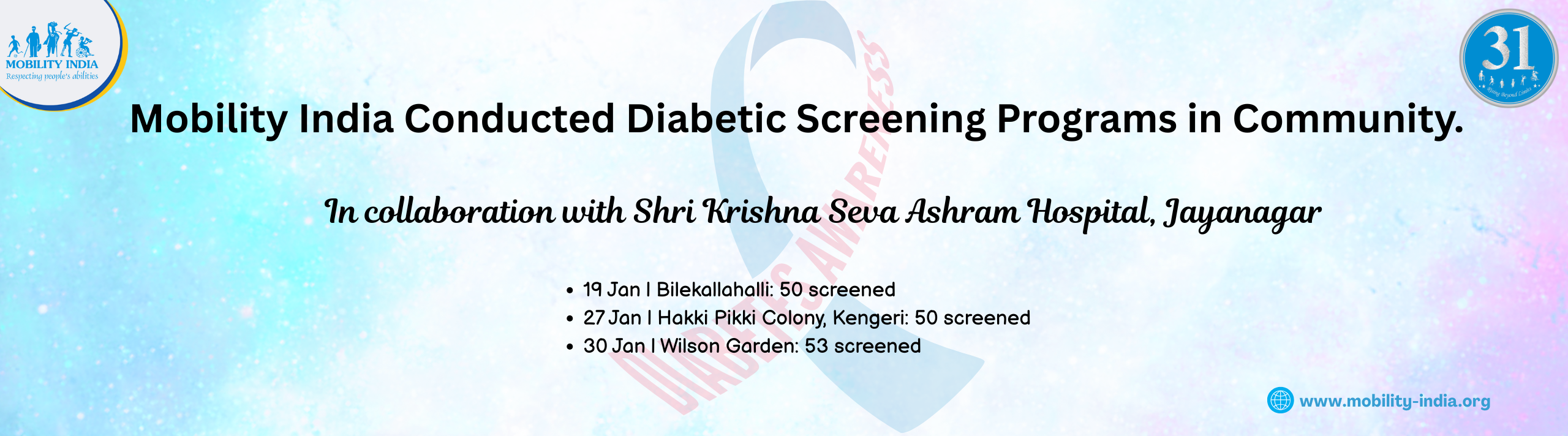 Mobility India’s Community Based Inclusive Development (CBID) team recently concluded a series of comprehensive diabetic screening programs in collaboration with Shri Krishna Seva Ashram Hospital, Jayanagar.